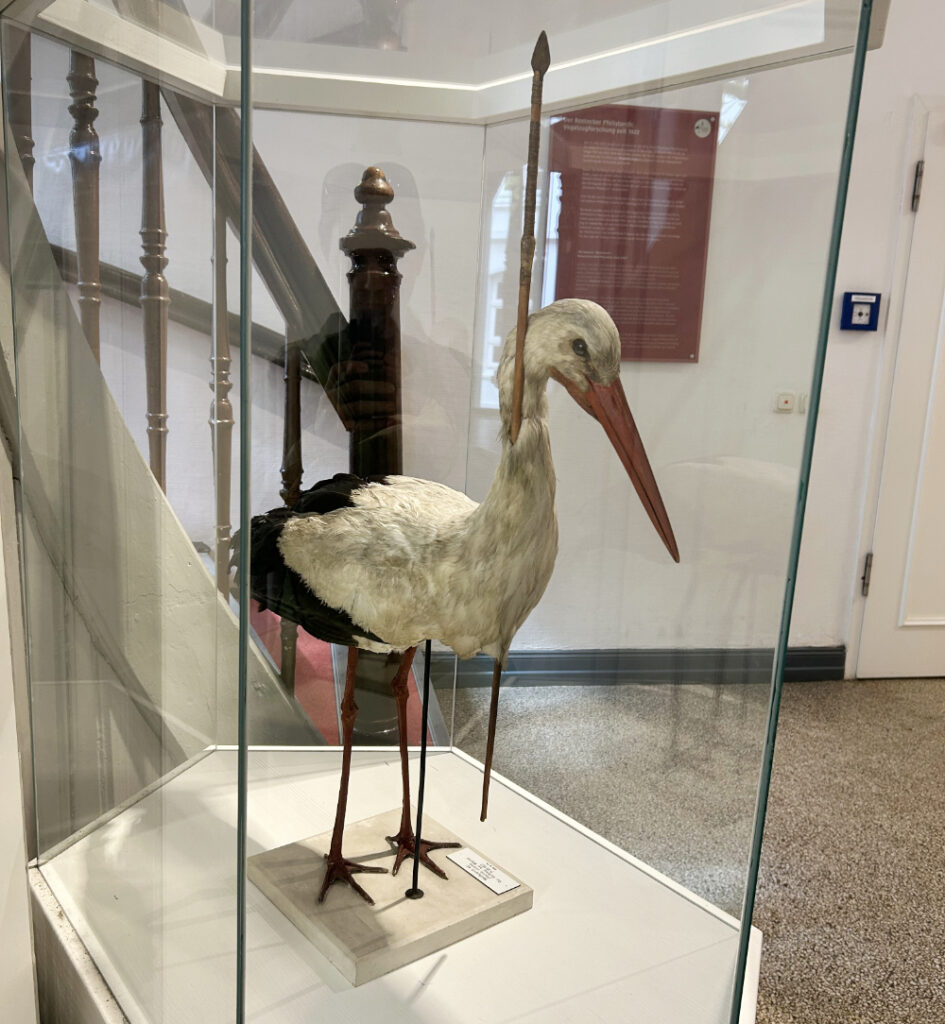 Meses antes de viajar, entrei em contato com a coordenação da coleção zoológica para confirmar se a Pfeilstorch ainda estava lá. Eles me responderam que eu não teria como deixar de vê-la: ela encontra-se em exibição logo após a entrada do museu, em destaque. Ela está representada até mesmo no logotipo da instituição.