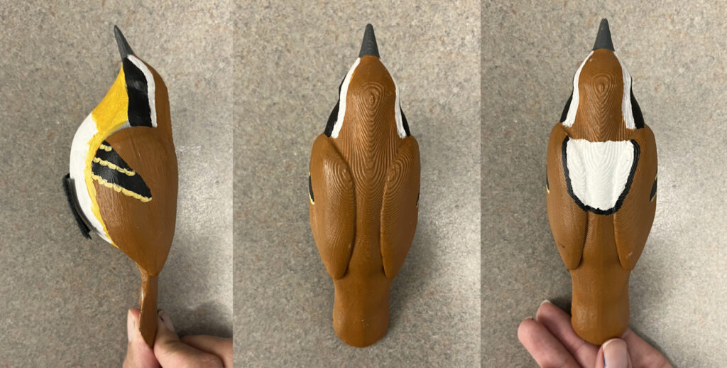 Eu trabalho na Biosphera3D e uma das coisas que a gente faz por lá é justamente modelagem em 3D, para diversos fins. Seguimos as instruções da Renata para modelar os passarinhos e, depois, com os arquivos em mãos, os modelos foram impressos e pintados manualmente por ela, um a um. Que trabalhão que deve ter dado!
