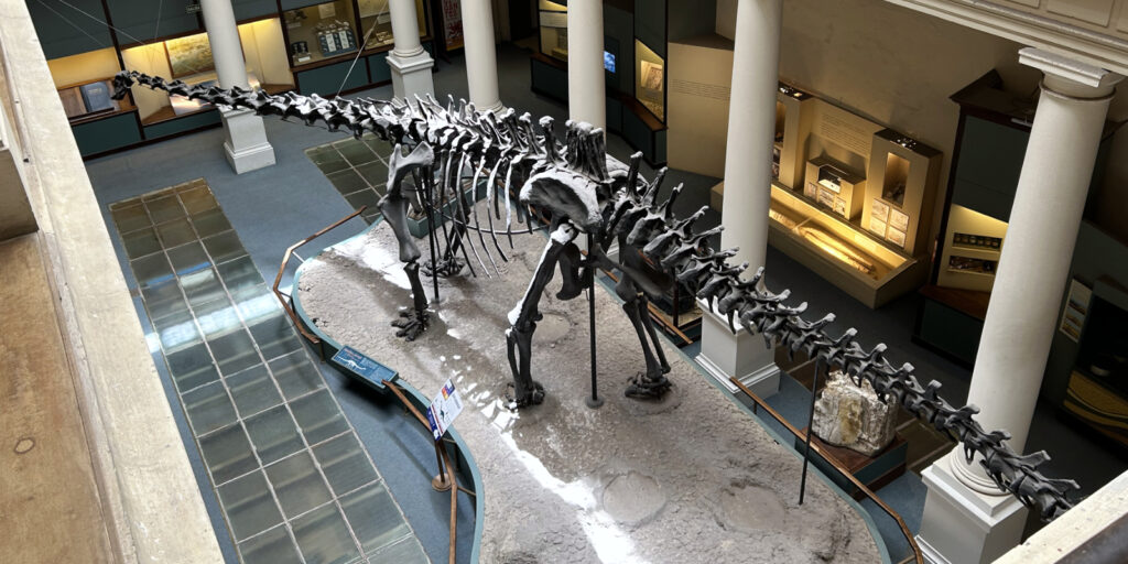 O enorme Diplodocus, um dinossauro que viveu no período Jurássico, também permanece em exposição. Com 27 metros de comprimento, a melhor maneira de observá-lo é a partir do segundo andar. Essa réplica está no museu desde 1912! Veio dos EUA de navio, acondicionada em 34 caixas. Levou um mês para ser montada. Centenária, já passou por muita manutenção, mudanças de cor e sobreviveu a uma chuva de granizo que quebrou as clarabóias do museu em 2008.