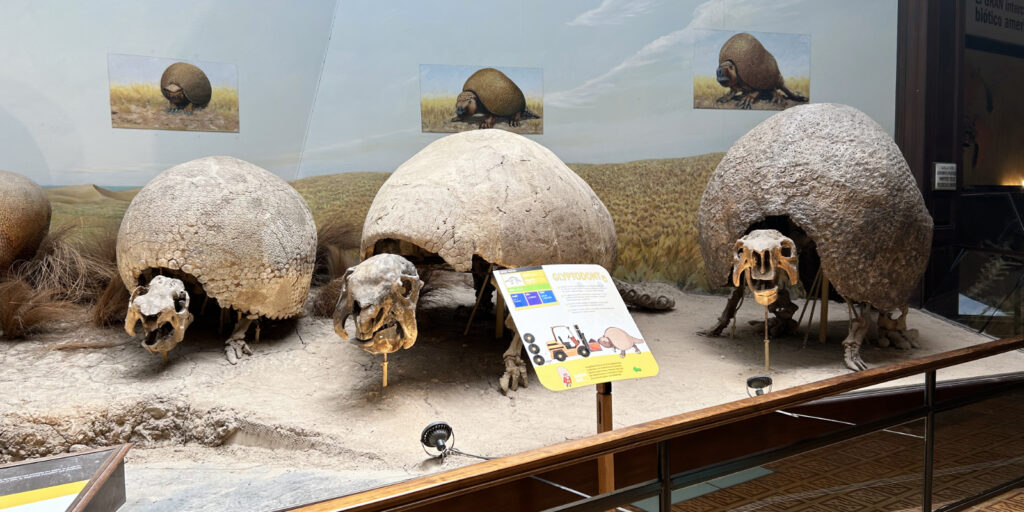 Este ano repeti o passeio: peguei um trem na Estação Constitución, em Buenos Aires, e uma hora e meia depois eu estava em La Plata, que é a capital da província de Buenos Aires. Saindo da estação de trem, caminhei uns 20 minutos até o museu. A exposição permanece muito parecida com aquela que guardei em minhas lembranças. Os gliptodontes, parentes próximos dos tatus, continuam lá no setor de Paleontologia. Esses mamíferos, já extintos, viveram nas Américas e eram bem grandinhos. Ainda fico boquiaberta quando vejo um exemplar de gliptodonte: parecem pequenos fuscas! Alguns, de fato, eram do tamanho de um carro, mas acho que não tem nenhum tão grande assim em exposição no museu de La Plata.