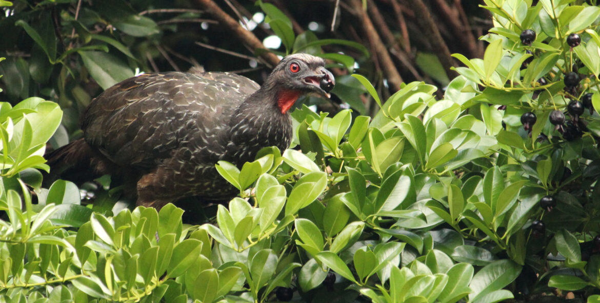A grumixama ou grumixameira (Eugenia brasiliensis) é uma árvore nativa da Mata Atlântica, sendo encontrada desde o Sul da Bahia até Santa Catarina. Produz uma grande quantidade de pequenos frutos que são muito apreciados pelos pássaros. Na foto acima, feita em Nazaré Paulista, vemos um jacuaçu enchendo o papo de grumixamas!